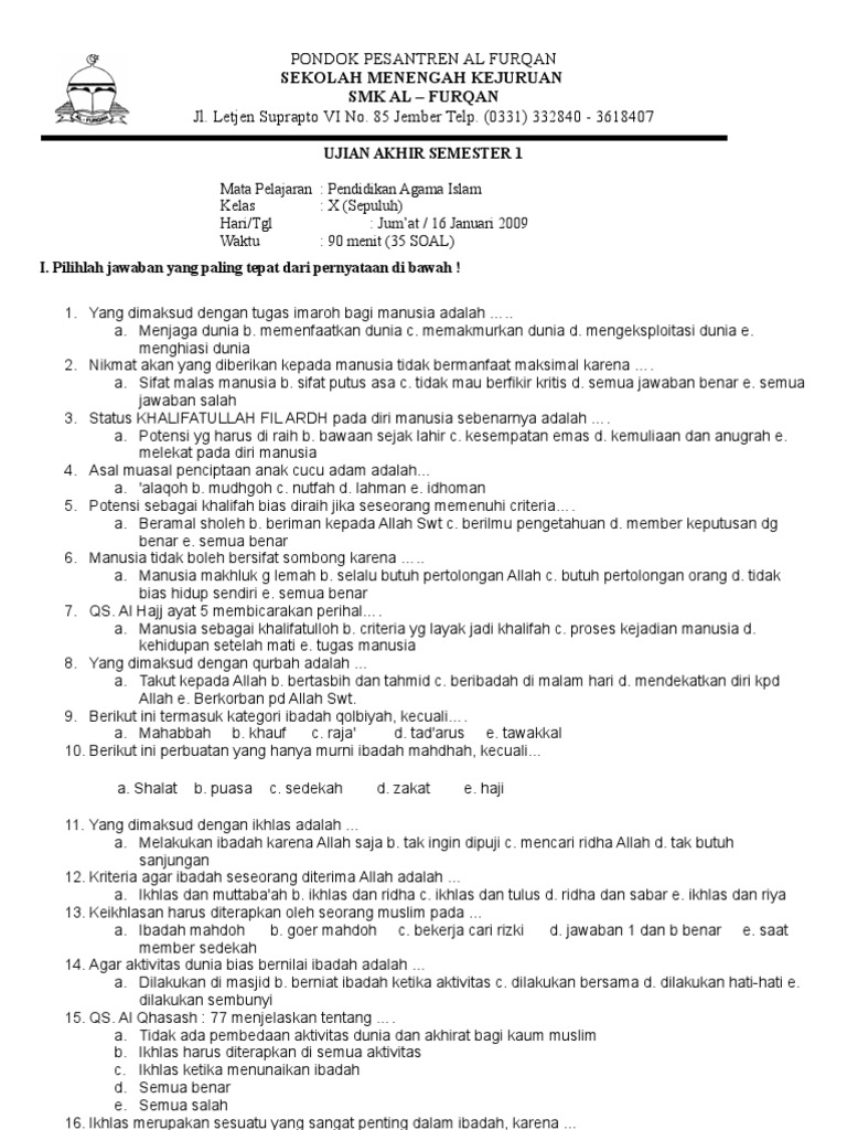 Soal Ujian Ulangan Uas Pai Kelas 10 X Sma Semester 1