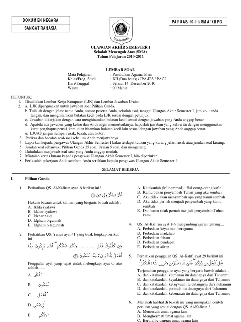 Contoh Soal Ujian Ulangan Uas Ukk Pai Kelas 12 Sma Semester 2