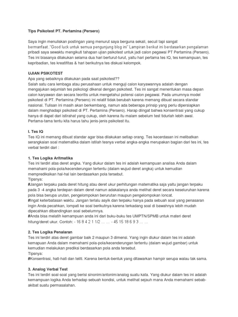 Soal Latihan Psikotest Pertamina 2017 Disusun Oleh Muhammad