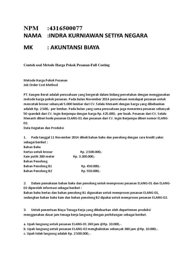 Metode Harga Pokok Pesanan Full Costing Contoh Kasus