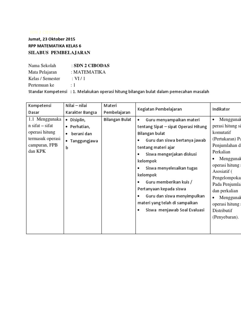Rpp Matematika Kelas 6 Semester 1 Pertemuan 1 4 Docx