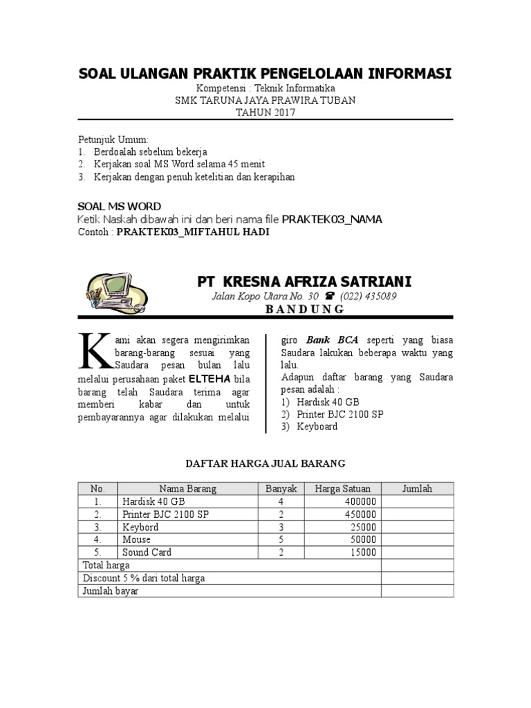 Doc Soal Latihan Praktek Ms Word 1 Doc Nurshobah Abdroqib