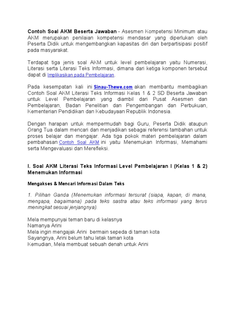 Soal Akm Literasi Sd Kelas 1. Unduh kumpulan soal akm literasi teks fiksi level 1. Mengakses dan mencari informasi dalam teks.