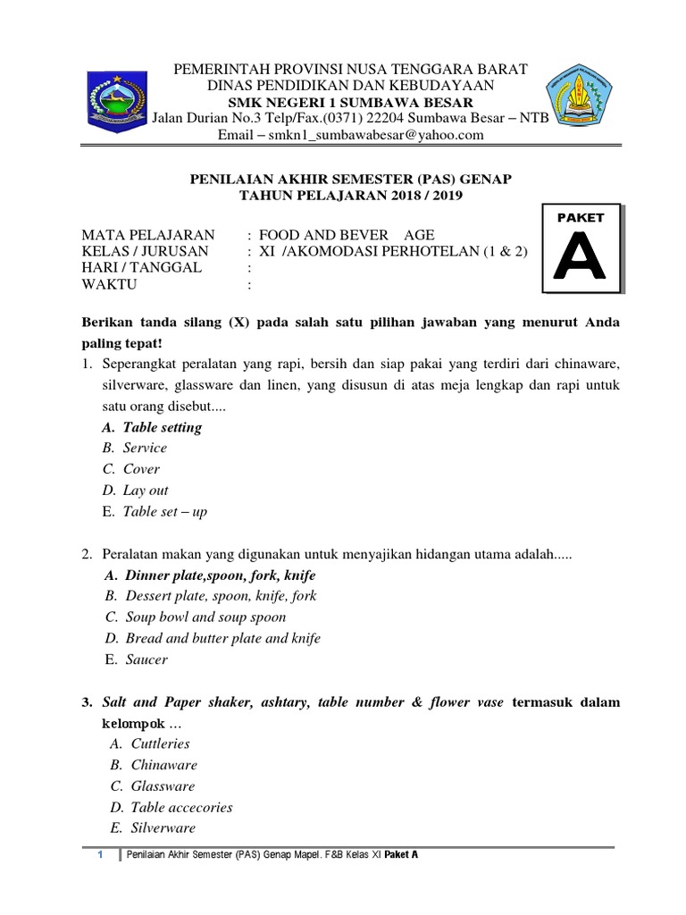 Soal F&B Service Kelas 12. Mar 02, 2021 · soal soal food and beverage berikut ini adalah soal soal food and beverage yang bisa anda download secara gratis di website kami. Contoh soal cpns 2020 terbaru dan pembahasan.
